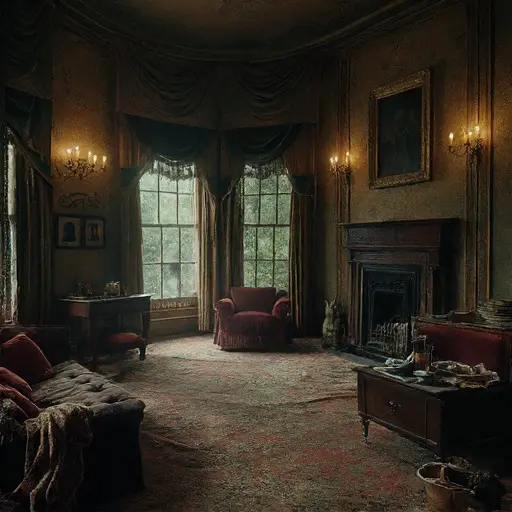 The parlour holds an air thick with the softened scent of old varnish, fabric rot, and the faint acidity of dried ink. Nothing suggests interruption or flight. Instead, Wyrdlatch House exudes the careful pause of a family who laid down their routines gently, expecting to resume them with the next day’s light.