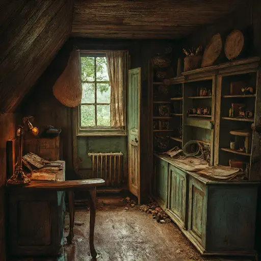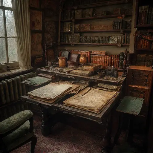 Hollis Branford Wyrdlatch, a railway tariffs clerk with a reputation for methodical precision, lived here with his wife, Elinora, and their daughter, Minna. Hollis’s routines were the quiet architecture of his days—ledgers sorted by route, receipts tied with twill, figures tallied twice before he permitted himself to sleep. His habits pour through the Study, where papers remain stacked at precise angles and envelopes lie sorted by unique categories only he understood.
