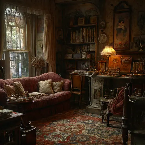 Stepping into the parlour of Thistledrift Eirenwall House, the air feels weighted by its own memory of movement. Dust rises in slow ribbons from the rugs, drifting toward the low lamp whose glow has softened every corner. The scent of cooled tea clings faintly beneath the musk of old wool.