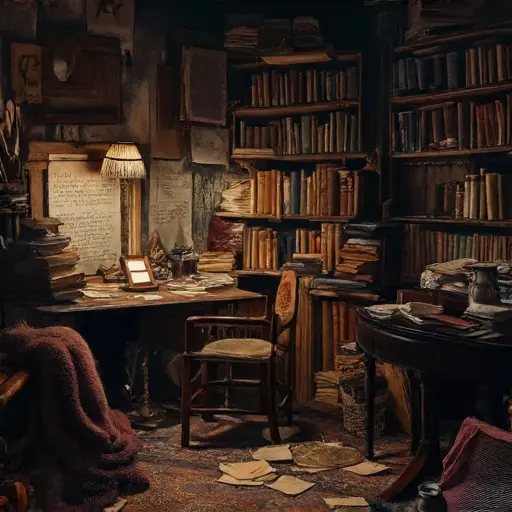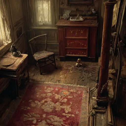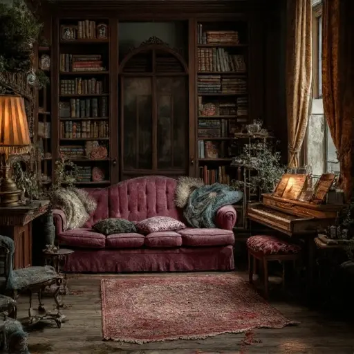 The parlour of Thornhallow Brynsethre House carries a gravity that seems woven through its softened fabrics and still corners. The faint scent of cooled tea lingers beneath dust and wool. Upholstery bends inward as though shaped by gestures repeated across years, now preserved only in the hollows they left behind.