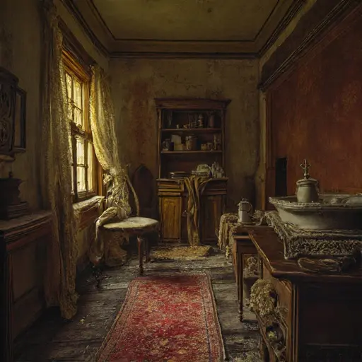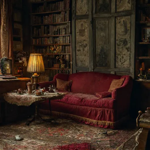 The parlour of Thornhallow Vexenford House holds the quiet weight of years folded inward. Dust glimmers in slow suspension near the hearth, settling across cushions that once welcomed routines now dissolved. The air carries the faint trace of lavender sachets crushed flat within drawers, and every contour speaks to a life paused mid-season.