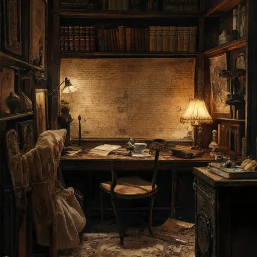 Aderyn Lyle Vexenford, tutor of household drafting and modest arithmetic, lived here with her niece Mirelle. Aderyn kept the drafting alcove arranged with sharpened graphite, folded diagrams, straightedges lined in perfect rank. Her temperament leaned meticulous yet quietly strained; she traced one slow circuit around the escritoire each dusk, aligning papers she reread for reassurance more than necessity. When Mirelle’s persistent fevers deepened and Aderyn’s own wrist stiffened from overuse, tuition waned. Bills thickened. Lamps burned lower. Papers once sorted neatly began to slope into careless stacks. The daily geometry that shaped her working life blurred into disarray, and the house mirrored her gradual exhaustion.