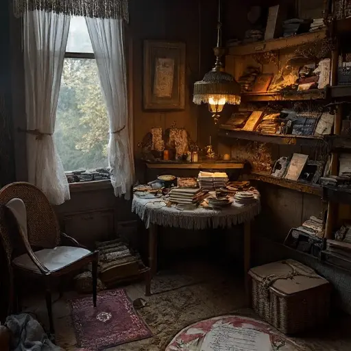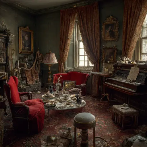 The parlour of Thornhallowe Virrisend House holds a dense stillness that seems shaped not by abandonment’s suddenness but by routines stretched thin until they dissolved. Cooled tea, wool, and stale ink trace the room in faint layers. Upholstery curves inward where evening habits once pressed deeply into the cushions.