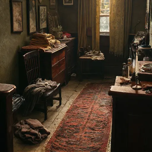 In the south corridor, shoes sit where Henrietta last placed them for polishing, bristles of the brush worn flat. A coat remains slung over a hall chair, sleeves creased from repeated tugging. The corridor’s wavering lamplight reveals the slow surrender of tasks once tightly kept: dust layering over unfinished mending, loose thread coiled on the banister, a fallen hairpin wedged beside the stair rod.