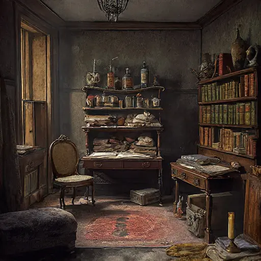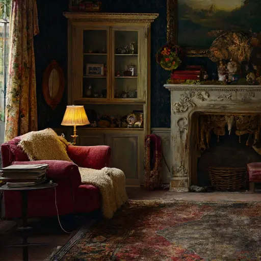 The parlour of Thornmere Quillfell House compresses time beneath stagnant lamplight. Upholstery sags where bodies once leaned, hearth tools lie scattered as though set aside for a moment that never resumed, and air hangs heavy with the faint tang of metal and old wool. Movement here faltered gradually rather than abruptly: drafts tracing along the floorboards, candles reduced to stubs, and rugs collecting the fine grit of seasons lived indoors.