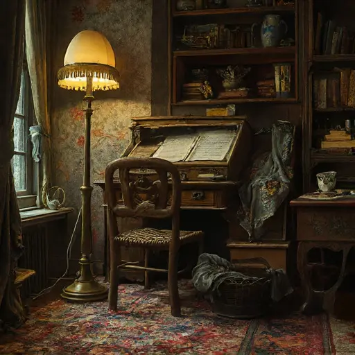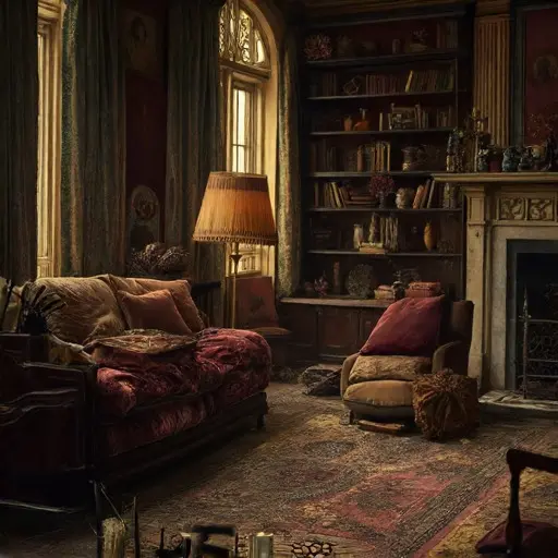 The parlour of Thornwex Pallamire House carries a softened outline of what once defined its evenings—quiet tasks, habitual gestures, the faint perfume of ink and tea. Everything feels paused mid-intention, yet no continuation ever arrived.