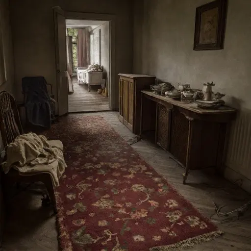 Along the inner north hallway, Merelith’s boots lean stiffly against the wainscot, their leather hardened by seasons of disuse. Jolvar’s unfinished clasp-setting blanks scatter near the baseboard, edges dulled by moisture. A cracked lamp chimney rests beside the dust cloth she dropped and never lifted again.