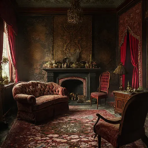 The parlour of Thornwicke Velisar House holds a hush carved by repetition that simply faded instead of ending. The air retains hints of cooled tea, wool warmed by lamplight, and long-settled ink. Upholstery curves inward where evening habits pressed themselves deeply, leaving shapes that never lifted again.