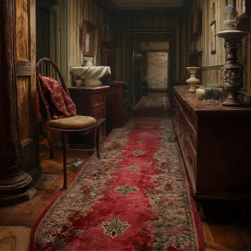 At the landing’s far end sits Edrienne’s final corrected slip—ink faint, margin wavering—beneath a shawl she never reclaimed. Rythen’s unfinished clasp blank remains beside it. Thornwicke Velisar House stays dim, unmoving, and indefinitely abandoned.