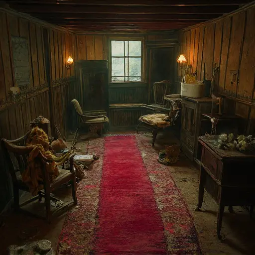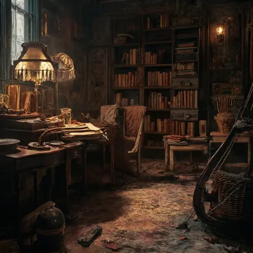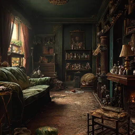 The parlour of Umberfen Wynscaithe House seems to hold its breath, as though the air learned to rest between each suspended particle of dust. A faint scent of cooled tea lingers beneath traces of old wool and drying paper. The furniture feels inward-turned, shaped by long habit and quiet fatigue rather than any recent human presence.