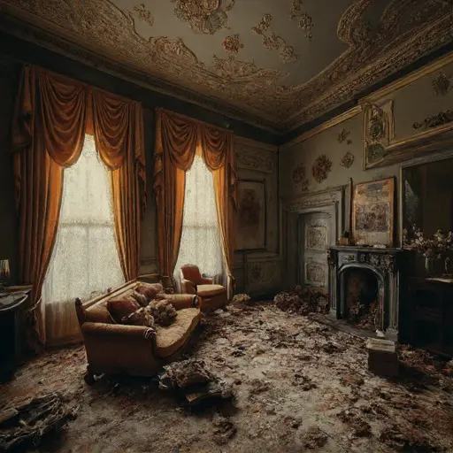 This house—Veylormere, a name appearing in no township record but etched once into an iron mantelplate—carries its history entirely through the rooms left behind. The first impression is quiet heaviness, the sort that collects when lives end not in spectacle but in slow attrition. Dust lies in soft drifts on piano keys never fully closed; a shawl remains folded on a chair as if its owner intended to return at dusk.