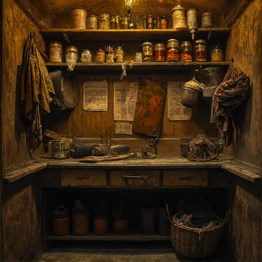 Past the dining room sits a small pantry whose cramped shelves bear witness to Eleanor’s waiting. Canning jars with clouded glass hold preserves long discolored; a handwritten recipe for plum cordial remains pressed beneath a milk-glass paperweight. A wicker basket still contains sewing scraps intended for a quilt she never finished.