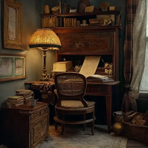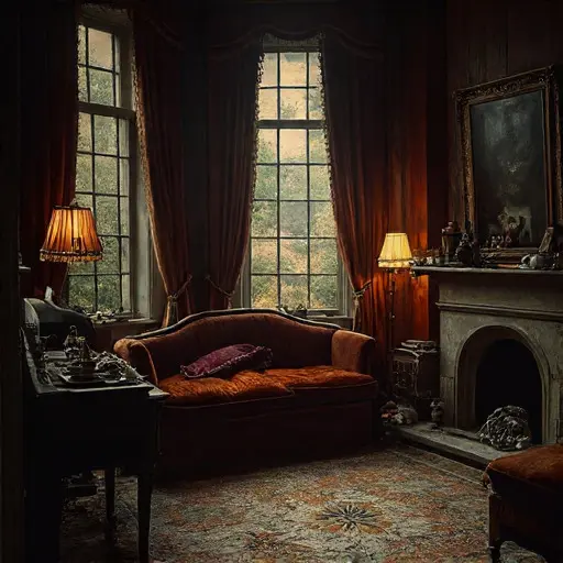 The parlour of Veylstrathe Morringlen House carries the softened imprint of routines that dimmed rather than ended. The faint scent of cooled tea and worn wool lingers above the furniture, holding the air in a muted stillness.