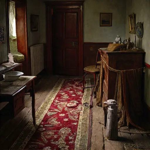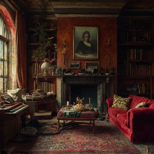 The parlour of Vorntallow Esmerynth House holds the softened gravity of a room once shaped by quiet domestic cycles. A faint trace of cooled tea hovers beneath the heavier scent of old wool and dust. Upholstery curves inward where bodies once settled in repetition.