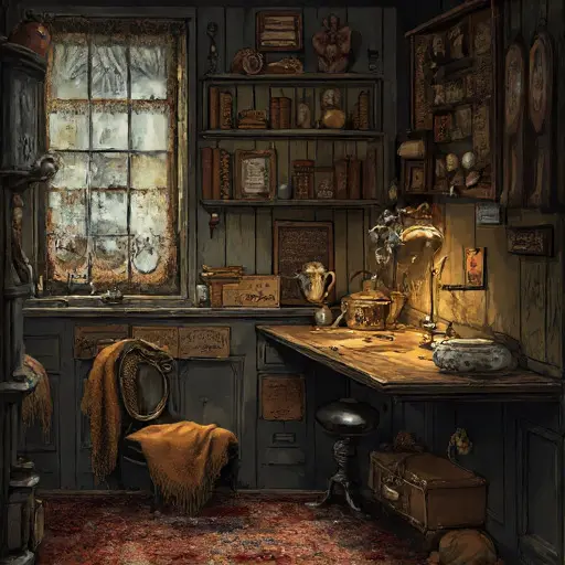Evalyne Esmerynth, tutor of household penmanship and arithmetic recitation, lived here with her cousin Rendal, a novice metal-etch apprentice whose income rose and fell without pattern. Evalyne maintained the quillwork alcove with strict precision—slates arranged by complexity, quills trimmed identically, blotters stacked without a single uneven edge. Before lessons she walked a patient loop, murmuring lines she meant to teach aloud. When Rendal’s work grew sporadic and Evalyne’s fingers stiffened in the winter drafts, her routine slipped. Sheets remained unmarked. Ink rims thickened. Order wavered until the alcove reflected her fatigue more clearly than any journal entry could.