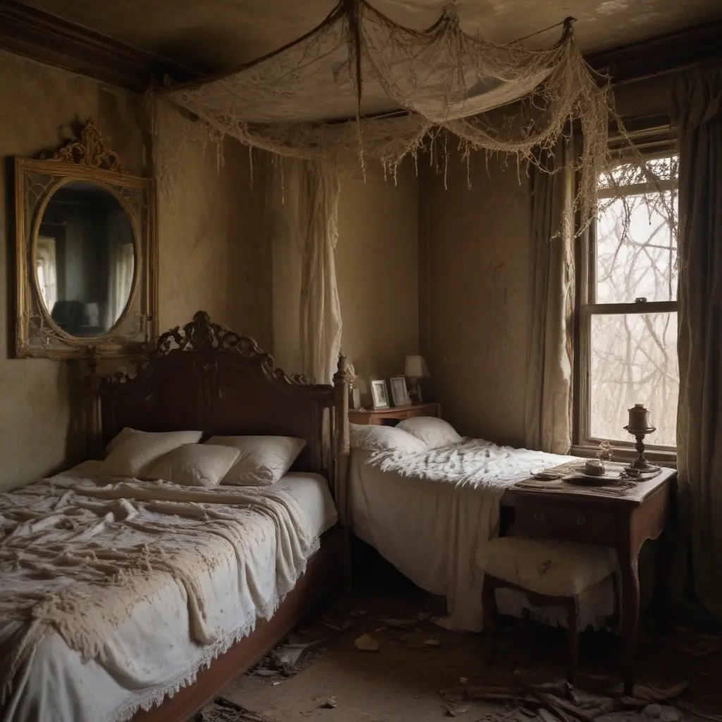 The bedrooms of Whispering Vale still exude ghostly beauty. Lace curtains hang like cobwebs, and the once-elegant furniture now bends under the weight of neglect. A single cracked mirror reflects the fragments of the room—a haunting reminder of lost identity.