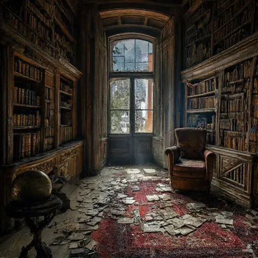 Whisperwood Manor, known for its extensive and esoteric collection of books, was the isolated domain of Mr. Alistair Finchley, the Library Curator from 1880 to 1905. Alistair’s life was dedicated to the preservation and cataloging of knowledge, a solitary existence amidst thousands of bound volumes. His small, internal office, tucked away behind a hidden door within the library, still contained the tools of his precise trade. Along one wall, shelves once held his hand-bound accession ledgers, now empty save for a few brittle, official stamps still affixed to the inside lining. The pervasive smell in the room was that of aged paper and dry leather binding. The most immediate sign of Alistair’s sudden absence was a small, high-backed wooden chair, overturned on the floor, its cushion flattened and covered in mildew, a silent disruption in a room defined by Lost order.