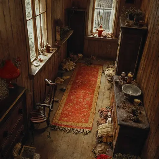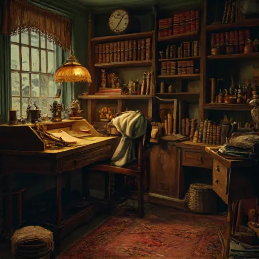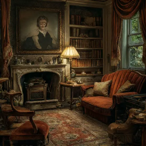 Stepping into the parlour of Wraithcombe Ellenshade House, one feels a faint compression in the air, as though the room were holding the last exhalation of its occupants. Dust gathers in suspended strands near the hearth, settling over cushions worn smooth by repeated gestures. The scent of cooled tea, wool, and dried lavender clings lightly to the fabric folds, never fully dissipating.