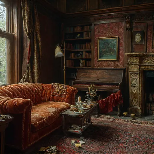 The parlour of Wynthallow Griscaryn House retains the softened outline of the life once lived here—teacups cooling untouched, fabric left mid-fold, the hush of an evening routine that faltered quietly and never resumed.